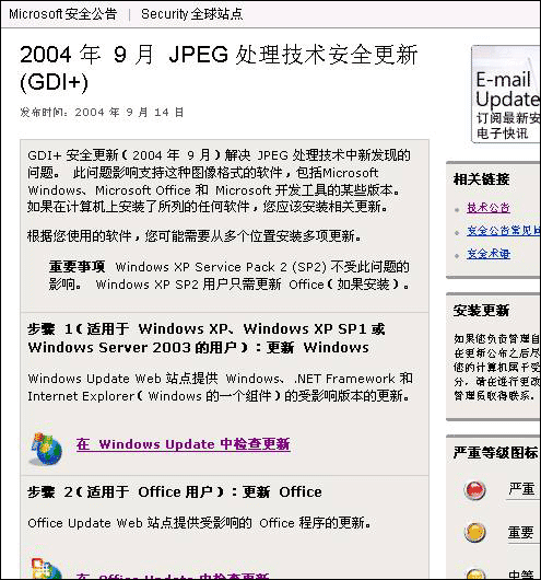 http://www.microsoft.com/china/security/Bulletins/200409_jpeg.mspx页面中选择“在Office Update中检查更新”