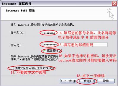 6 .在这个页面输入帐号名字和密码,请注意,不要选择“使用安全密码身份登陆”这个选项。然后点击下一步。